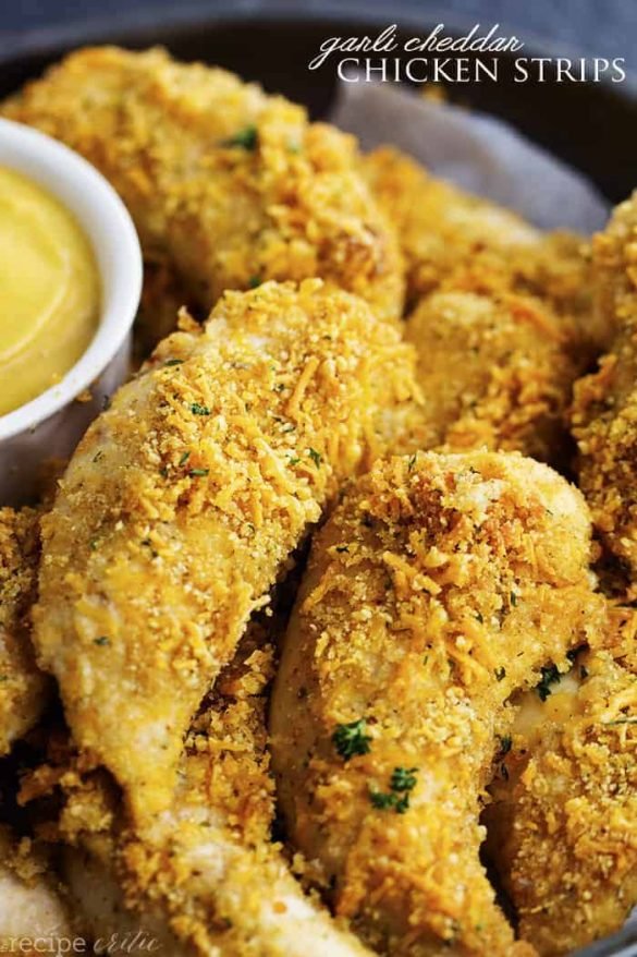 A quick and easy baked chicken strip that is coated in a buttery garlic and cheddar cheese. They have such amazing flavor and are sure to be a meal that the entire family loves!