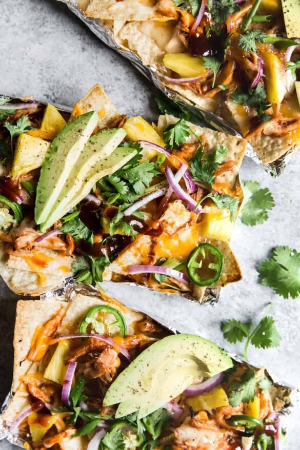• Fill each tray with a handful of tortilla chips. Sprinkle the chips evenly with half of the cheese. Add the bbq chicken in small pieces, followed by the pineapple, red onion and jalapeño. Top with remaining cheese and place foil trays directly on the grill until the cheese is melted and the outer chips are starting to brown. About 5-10 minutes depending on the grill.