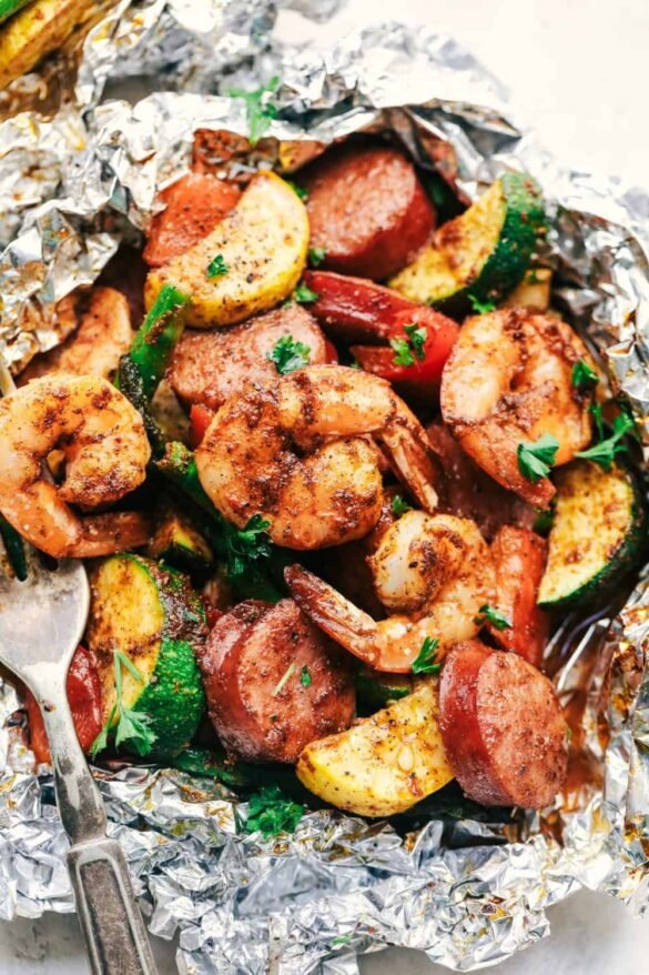 Cajun Shrimp and Sausage Foil Packets are loaded with shrimp, sausage, summer vegetables and tossed in cajun spices. These are quick and easy and packed with big flavor!