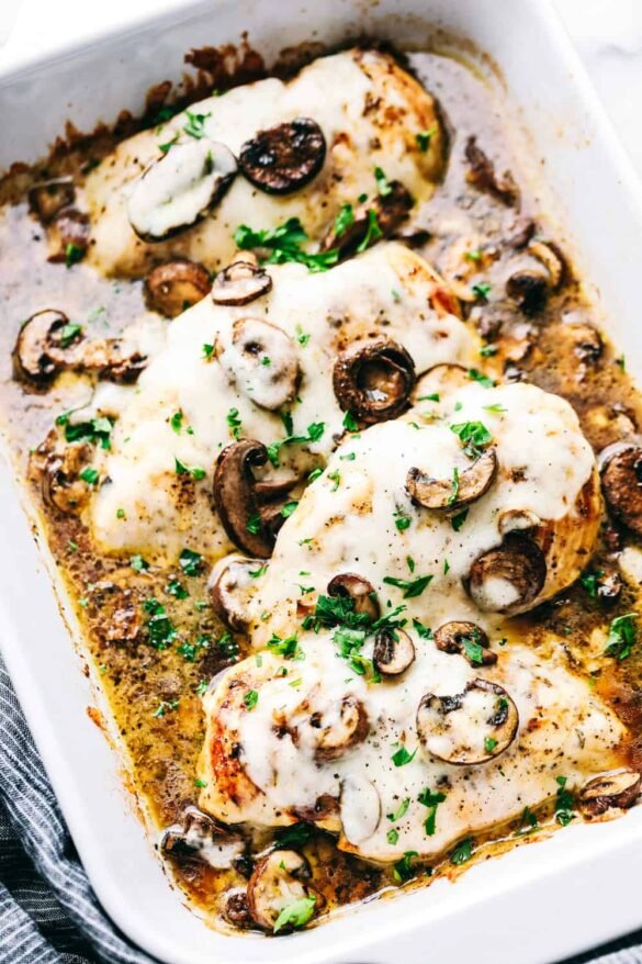 Easy Baked Cheesy Mushroom Chicken has a melted cheese covering the tender chicken breast with flavorful mushrooms and mushroom sauce to enhance every bite. The cheese melts and blend the chicken and mushroom flavors together making a meal that is unforgettable. Preparing this meal is a breeze and gives you more time to spend with your family!