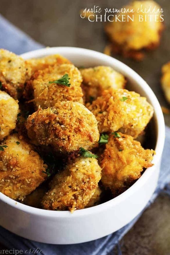Tender and juicy chicken bites that are coated in a buttery garlic parmesan cheddar breading. They are baked to crispy perfection and the entire family will devour them!