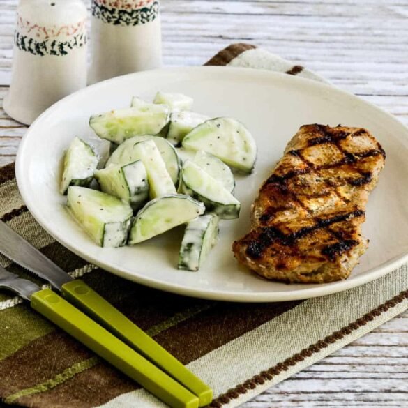 The grilled pork chop in the photo is being served with Easy Low-Carb Cucumbers Caesar. Pork chops like this would also taste great with Easy Air-Fryer Asparagus with Lemon and Parmesan, Cucumber Salad with Avocado and Feta, Chopped Greek Salad with Peppers, or Spicy Grilled Eggplant.