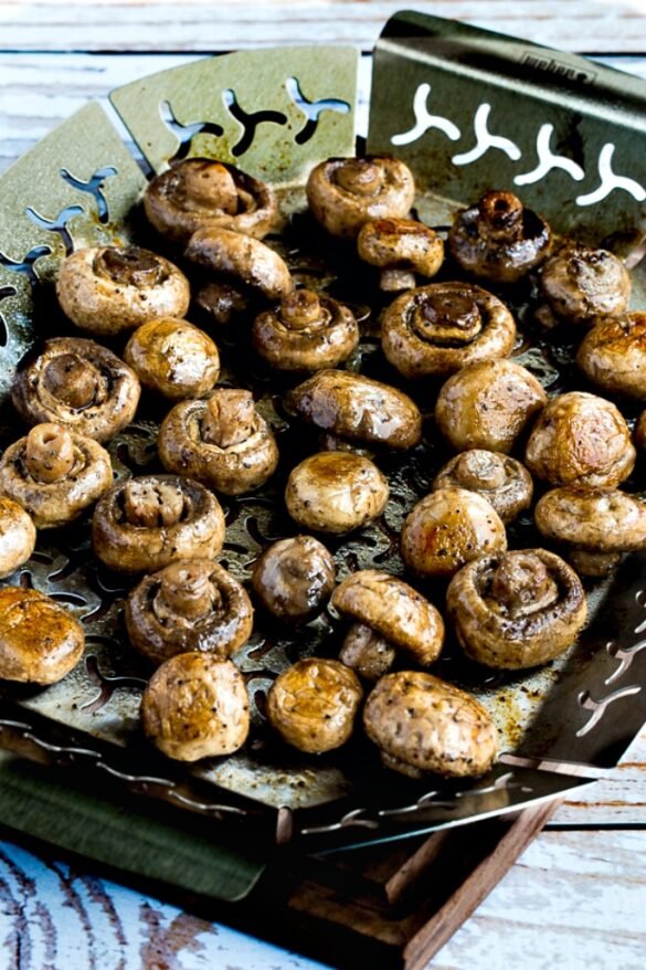 These grilled mushrooms would be delicious with something like Ultra Easy Lemon Pesto Chicken Kabobs, Grilled Chicken with Balsamic Vinegar, Grilled Sausage and Peppers, Sanpete County Grilled Turkey Kabobs, or Grilled Flat Iron Steak with Chimichurri Sauce for a low-carb meal.