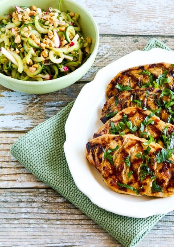 Low-Carb Grilled Fusion Chicken on serving plate with cucumber noodle salad on the side