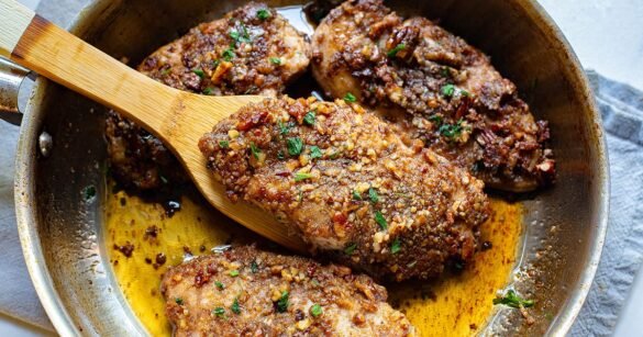 Pecan-crusted chicken with a touch of garlic, fried in a skillet for that perfect crispy finish and drizzled with honey to bring a little sweetness that goes so well with nutty, earthy pecans and savoury chicken. You’d be fooled to think this restaurant-quality dish is difficult to make, but it’s incredibly simple.