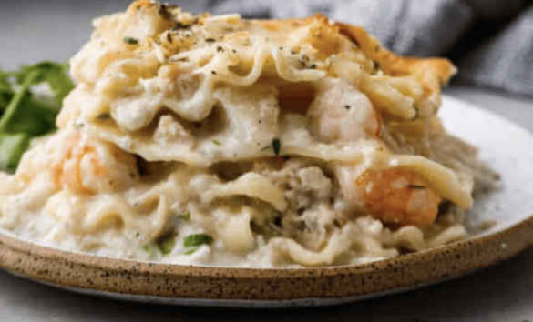 Seafood lasagna is bursting with all your favorite seafood flavors baked together in one pan! You will love the crab, scallops, and shrimp nestled in between cheesy lasagna layers and smothered in a delicious white sauce.