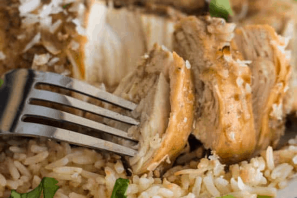 Slow Cooker coconut chicken with coconut garnish, sitting on rice and a white plate.