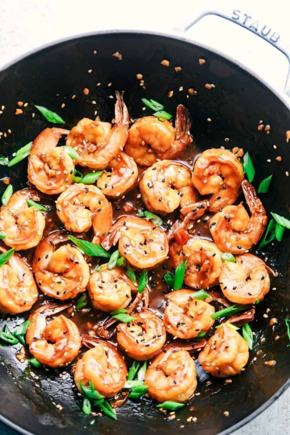 - Add the marinade to the skillet and simmer until it starts to thicken and turn into a syrup. Add the shrimp back to the skillet and toss to coat. Serve over rice with green onions and sesame seeds.