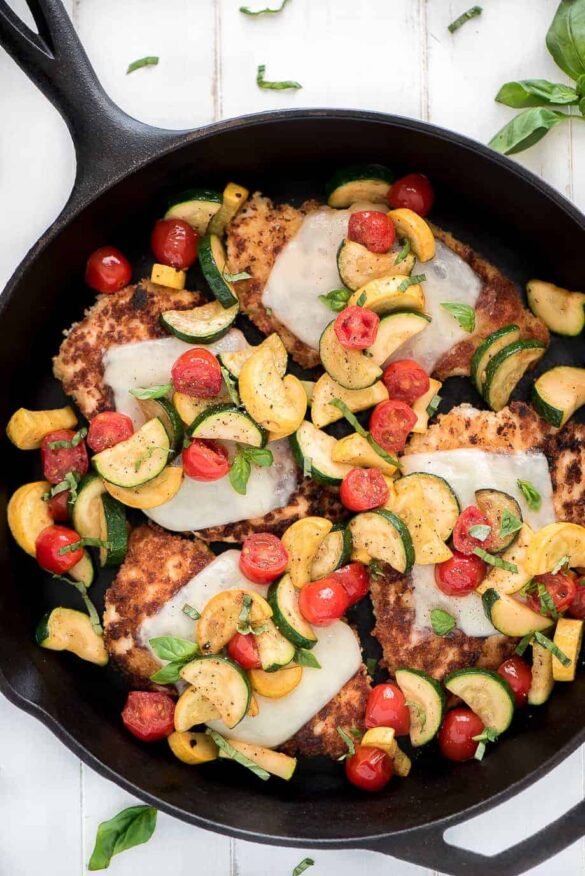 This 20-minute Summer Chicken Parmesan has that classic delicious crispy coating but instead of smothering it in red sauce it’s topped with your favorite summer veggies and ribbons of fresh basil.