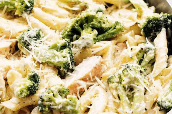 - Add the pasta to the skillet: Combine cooked pasta with sauce and toss to coat. Finally, add in your cooked chicken and broccoli. Toss to coat and serve immediately. Garnish with shredded parmesan cheese if desired.